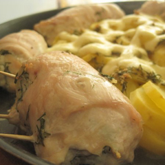 Начинкой может быть раскрошенная фета или брынза. К сыру добавить чеснока или посыпать сухими травами в комбинации орегано - тимьян - базилик. Еще хорошо положить внутрь жаренных с луком грибов, добавив к ним немного тертого твердого сыра. К той и другой начинке необходимо добавить по кусочку (размером с лесной орех) сливочного масла. Заворачивать начинку не просто рулетом, а именно, как закручивают фаршированные блины - конвертом, чтобы начинка не вываливалась и масло не вытекало. Для надежности можно кое-где подколоть мясо деревянными зубочистками.