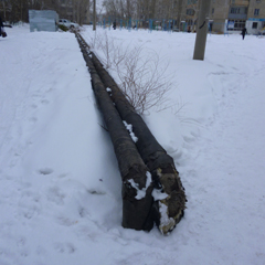 Трубы между двумя другими домами по пр. Абая - самого маленького диаметра. Изоляция на них отсутствует в двух местах. Трубы проходят за домами частного сектора и сейчас утопают в снегу и земле. Теплотрасса разветвляется в две стороны вдоль пр. Абая: один участок в сторону дома № 44/1, второй - в сторону дома № 52. В обе стороны идут по две тонкие трубы, полностью открытые на протяжении 15 м каждый.