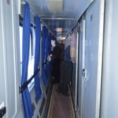 20 января 2013 года я ехала в купейном вагоне из Аркалыка в Костанай. Ехать пришлось в старом, грязном вагоне. Один из двух туалетов был закрыт, так как коробка, на которой установлен унитаз, отсутствовала. Обивка в купе, которая когда-то была синего цвета, стала черной от грязи. Везде пятна, ржавчина. Окна в коридоре обклеены желтым скотчем, паласы в коридорах - в пятнах. После отправки проводница разогревала вагон дровами. Я так понимаю, что это все должно работать за счет электричества. Первое время пассажиры ходили за кипятком в другие вагоны.