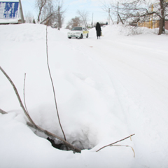 Корреспондент «НГ» побывал на перекрестке улиц Рудненской и Карла Маркса. Открытый колодец местные жители обозначили воткнутыми ветками деревьев и привязанными к ним пакетами, чтобы было видно издалека. Колодец наполовину занесен снегом, но внутри видны проходящие кабели. Делаем предположение, что колодец принадлежит областной дирекции телекоммуникаций АО «Казахтелеком».