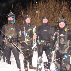 Иногда события, предшествующие нырялке, становятся не менее захватывающими, чем сама подводная охота. По первичным разведданным в районе рудненских дач (возле общества «Юбилейное») замечено примерно сто метров открытой воды. Туда и наметили очередной выезд. Добирались с приключениями. «Ленд Ровер Дискавери» бороздил метровые сугробы с легкостью, но даже он на 300 метров не доехал до воды. Пришлось идти лисьими тропами, а снаряжение тащить, впрягшись в санки вдвоем. Там только свинца около 60 кг плюс 15 литров горячей воды, подводные ружья, гидрокостюмы, фонари. Каждый метр сугробов давался с трудом. Когда дошли до воды, одежду можно было выжимать. Она намокла от пота.