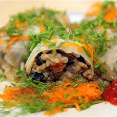 Ну, одна начинка, можно сказать, классическая для постного стола: грибы с рисом. Крупу отварить до полуготовности, мелко нарубить и поджарить грибы с луком. Грибы любые. Когда будете жарить и в сковороде появится изрядно грибного сока, отберите его. Потом соедините с соусом для тушения. В начинку можно еще добавить нашинкованную и обжаренную морковку.