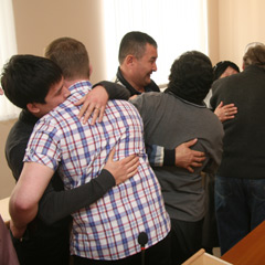 Сразу после оглашения подсудимые смогли обняться с родственниками. Со всех сторон слышались поздравления в адрес Русакова и Елеусизова.
