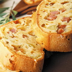 На 1,5 ст. муки - 2,5 ч. ложки разрыхлителя, 1 ч. ложку сахара, 0,5 ч. л. соли, 4 больших яйца, 0,5 стак. белого вина, 3 ст. ложки портвейна (по желанию), 4 ст. ложки оливкового масла, 200 г ветчины, 200 г твердого сыра нарежьте маленькими кубиками, полстакана зеленых оливок без косточек, 1,5 ст. ложки сухого сладкого перца, щепотку душистой травы.