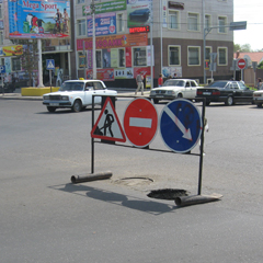 На пересечении улиц Амангельды - Алтынсарина корреспонденты «НГ» увидели провалившийся асфальт. Рядом с новым канализационным люком - такого же размера яма. Асфальт еще новый, но на нем уже яма. Недавно ее огородили знаком дорожных работ. Знак, конечно, предупреждает об опасной яме, но в то же время мешает интенсивному движению автомобилей и автобусов, которые с прошлого года пустили по улице Амангельды.