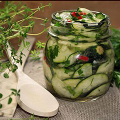 Они точно в маринадах не хуже огурцов, а то и лучше. Особенно если не жадничать и класть в банку молоденькие. Кабачки той степени зрелости, когда не надо удалять семена, нарезать вдоль на 4-6 частей. Если они у вас больше 20 см в длину, то сначала цилиндр размахнуть пополам поперек, а потом строгать, как сказано.