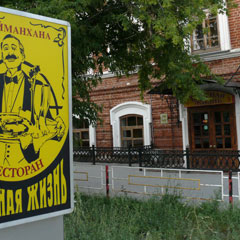 И вот приехала. Следом примчалась навестить российская подружка. Памятуя, как таскалась «у них» с подносами, приглашаю ее в ресторан. Не куда-нибудь - во «Вкусную жизнь», благо летник в бывшем музейном дворе работает. Ресторан проверенный. По прежним наблюдениям кухня слабовата, но сервис на уровне. И даже живая музыка имеется.
