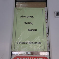 Фотографию, сделанную в одном из магазинов Костаная, указывающую на отдел, где продаются колготки, чулки и носки, ее автор Владимир КРИКУН сопроводил таким комментарием: «Железная логика. Ну а где ж им еще быть? В ношенном состоянии - натуральная химия...»