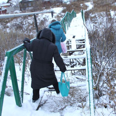 Корреспонденты «НГ» побывали на указанном месте. Мостик над логом Костанай-сай металлический длиной около 20 м. На участке длиной около 5 м отсутствует настил, люди перелазят с перекладины на перекладину. В тот день, когда там побывали журналисты, выпал снег. Металлические перекладины обледенели, в результате мостик стали еще более скользким и опасным.