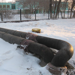 На месте корреспонденты «НГ» увидели, что трубы большого диаметра проходят вдоль ограды детского сада. В одном месте, где трубы уходят под землю, оголен участок длиной около 1 м, чуть дальше еще один участок абсолютно «голой» теплотрассы. Даже на закрытых участках изоляция довольно ветхая.