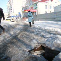 - Колодец открыт с осени прошлого года, - говорит он. - Еще когда снег не выпал, на него, наверное, наехала грузовая машина, поэтому крышка провалилась внутрь. Там очень много людей ходят, машины ездят, а колодец прямо на дороге расположен. Надо вовремя меры принять, пока кто-нибудь не провалился.