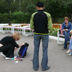 Через полчаса в Центральном сквере споткнулась и упала девушка. Из ее чемоданчика прямо под ноги отдыхающим на скамейках гражданам посыпались: фривольные чулочки с резинками, такие же трусики, упомянутые уже презервативы и - розовая гордость коллекции. Две парочки застыли на скамейках с ошарашенными лицами. Кто-то из девушек испуганно взвизгнул, кто-то захихикал. Парни, ухмыляясь, разглядывали копошащуюся на земле девицу.