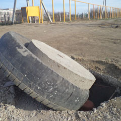 Колодцы водопровода на ул. Молодежной в п. Дружба, о которых мы писали в прошлом номере, закрыли бетонными крышками. Только одну из них положили поверх покрышки от машины. Сейчас покрышку сдвинули, вновь появилась опасность. Остался открытым колодец газопровода, бетонное основание которого полностью разрушено колесами грузовиков. Возможно, этот колодец принадлежит КПФ АО «КазТрансГаз Аймак».