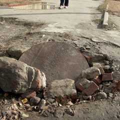 Корреспондент «НГ» побывал на указанном месте. На улице Гвардейской, возле проезда во двор дома № 14, обнаружил колодец. Кирпичное основание сломано, металлическая крышка лежит под углом 45 градусов, так что образуется достаточно большое отверстие. Колодец находится на въезде к складам магазина, видимо, машины раздавили люк. Определить, какие внизу коммуникации, не удалось, но именно такие самодельные крышки делают в ГКП «Костанай-Су». Кроме того, по этой линии проходит ветка водопровода.