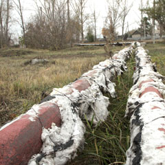 На месте корреспонденты «НГ» увидели длинный участок теплотрассы, который действительно прикрывают только мелкие клочки изоляционного материала. Конечно, роль утеплителя он в данном случае не выполняет.