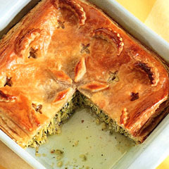 Средиземноморский пирог делается из слоеного теста. Натрите кабачки, отожмите. Добавьте тертый сыр, яйца, чеснок, мяту или кинзу, приправьте солью и перцем. Затем смесь разложите по дну формы, накройте листом теста толщиной 3-5 мм, сделав в этой крышке прорези ножом для выхода пара. Печь 15-20 минут.