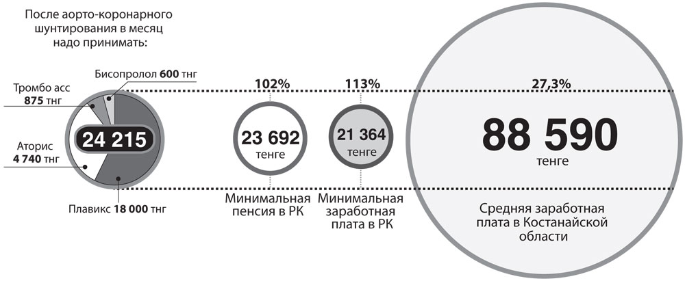 Знакомый предприниматель предоставил «НГ» раскладку того, сколько стоит ему жить после операции - аортокоронарного шунтирования. Саму операцию в Национальном научном медицинском центре сделали бесплатно. А после нее назначили серию препаратов, которые пациенту необходимо принимать в течение года: «Плавикс», «Аторис», «бисопролол», «Тромбо АСС». Все вместе сегодня стоит более 24 тысяч тенге в месяц. Сравните с размерами прожиточного минимума, минимальной пенсией да даже со средней зарплатой в Костанайской области, размеры которых приведены в нашей инфографике. А если бы оперировался не предприниматель? Наш, кстати, знакомый - уже пенсионер. Это ж какая пенсия выдержит такие жизненно необходимые расходы? И по большому счету - зачем спасать, если потом все так оборачивается?