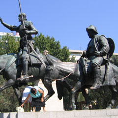 Если же пройти всю эту улицу до самого конца, то вы обязательно попадёте на одну из самых знаменитых площадей столицы. И можно ручаться, что она покажется вам очень знакомой. Вы могли видеть её на открытках, в любом путеводителе. Площадь Испании. В центре стоит памятник бессмертному Сервантесу с его знаменитыми Дон Кихотом и Санчо Пансой. Тощий Россинант, гордо вскинув голову, смотрит вдаль. Восседающий на нём худой Рыцарь Печального Образа крепко держит копьё. Рядом, на своём ослике сидит верный оруженосец. А внизу, под памятником, обычно толпится кучка туристов, дожидающихся очереди взобраться к героям испанской классики, чтобы запечатлеть себя на память в их компании. От ежедневного прикосновения множества рук крупы и осла, и лошади лоснятся...