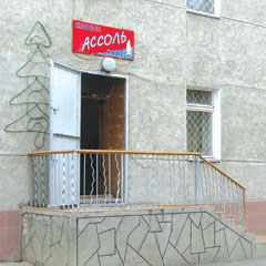 В поисках своего капитана отправляюсь к кафе «Ассоль» в здание бывшего облсовпрофа. Наша доморощенная «Ассоль», как и гриновская, явно из семьи с небольшим достатком - одета в простенькую вывеску, скромненькие входные двери и ступеньки.