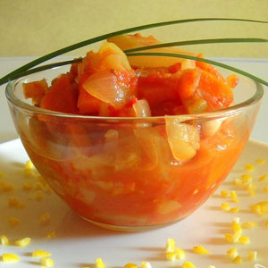 Для такого салата понадобятся помидоры, болгарский перец, морковь, лук, чеснок. Перец нарезать соломкой; ломтиками, сопоставимыми с ней, - кабачок, морковь - на крупной терке; лук - кубиками; помидоры превратить в пюре любым доступным способом. Можно включить блендер, а можно и мясорубкой обойтись.