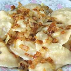 Вареники от Королевой: на 500 г картофеля надо взять 300 г творога, 100-150 г шпика, 1 большую луковицу. Тесто обычное пельменное.