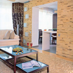 Элементы усиления, обрамляющие проем, в результате оказались почти вдвое толще самой стены, поэтому конструкция выглядела достаточно массивной. Архитектор предложила отделать прем декоративным камнем светло-охристого цвета. Это не только позволило полностью устранить тяжеловестность, но и задало лейтмотив в оформлении интерьера жилища: таким же камнем облицованы прихожая, простенок между дверьми в спальню и детскую, а также фрагменты колонн зонирующей перегородки. Искусственный камень крепили на специальный акриловый клей с армирующими волокнами. Чтобы куски камня хорошо стыковались между собой, их края пришлось тщательно обточить.