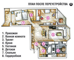 Предложенные архитектором вариант перепланировки полностью устраивал хозяев. Он преждусматривал использование прохода между прихожей и кухней для расширения ванной комнаты, устройство проема во внутренней несущей стене между гостиной и кухней, ликвидацию перегородки между прихожей и гостиной, иную организацию входногопространства перед детской и спальней. В результате увеличения «санитарной» зоны за счет прохода в кухню удалось обустроить отдельные туалет и ванную комнату площадью 5,2 кв. м. При входе в квартиру осталась небольшая прихожая, плавно перетекающая в гостиную-студию. Зона отдыха в студии ненавязчиво отделена от проходной зоны изящной гипсокартонной конструкцией, которая состоит из терх колонн, скрепленных декоративными блоками. Со стороны гостиной перед этой стенкой расположены большой ЖК-телевизор, и также аудио и видеотехника.
