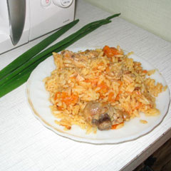 Считается, что плов с большим количеством фруктов - это плов по-фергански. Обычно в него кладут курагу, кишмиш - изюм без косточек, чернослив. Ну и само собой - морковь. Если готовите с мясом, то лук вполне уместен. Если постный плов - то вкусно и без лука.