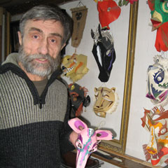 Костанайский художник Георгий СОКОВ Новый год встречает по-своему, изготавливая маску-оригами символа наступающего года. К девяти маскам в его мастерской недавно добавилась десятая - маска крысы, выполненная из розовой, бирюзовой и фиолетовой бумаги, кусочков замши, фольги и серебристых пуговиц.