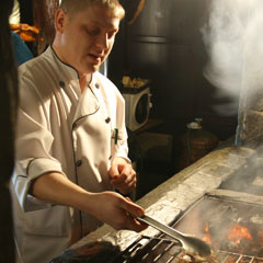 Олег использует масляную рыбу, которую, как он считает, в принципе можно заменить белугой. Рыбное филе нарезается крупными брусочками толщиной 2-3 см. Затем рыба солится, перчится, сдабривается специями и маринуется в апельсиновом соке. Для одной порции требуется сок половинки апельсина. Маринуется рыбка таким образом 15-20 минут. Затем каждый брусочек заворачивается в пластинку бекона, нанизывается на шпажку и жарится 5-7 минут на жаровне.