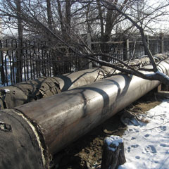 Выехав на место, корреспонденты «НГ» убедились: несколько метров тонких труб лежат на глыбах льда. Вода, которая постоянно из них течет, превратилась в «хрустальные» ножки. Чуть дальше - трубы большого диаметра, на которых мы не нашли ни одного участка, который был надежно прикрыт изоляцией. Повсюду куски ветхой материи, обветшавший рубероид, а большей частью - просто «голые» трубы.