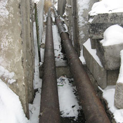Ничем не прикрытые трубы большого диаметра корреспонденты «НГ» обнаружили в куче строительных материалов. Среди плит и кирпичей оказалось больше 10 м открытой теплотрассы.