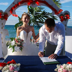 - В отеле мы с менеджером обсудили проведение свадебной церемонии. Написали торжественную речь по нашему образцу. Менеджеру было самому в диковинку, ведь они в основном устраивают свадьбы для европейцев, а у них свои традиции, - рассказывает Елена. - В 4 часа дня началась церемония. Свадебный шатер установили на берегу, тут же накрыли праздничный стол. Многие туристы сбежались посмотреть на нас, аплодировали, когда мы ставили свои подписи под свадебным сертификатом, кричали «Горько». Конечно, сертификат не имеет никакой юридической силы - это просто память о знаменательном дне. Мы соблюли все традиции: после того как скрепили наш союз поцелуем и распили шампанское, пошли танцевать наш свадебный танец. Ужин шикарный нам организовали: коктейль из креветок в ананасе, запеченые лангусты, потрясающе вкусное шампанское. В завершение вечера нам подали горящий свадебный торт. Его полили чем-то сверху и подожгли. Нанятый нами фотограф снимал это торжество, и это - память на всю жизнь!