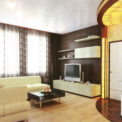 Особенность данного проекта - выделение в гостиной обособленной зоны с фортепиано для занятий музыкой, которая становится композиционным и общественным центром квартиры, где собирается вся семья. Перегородки, отделяющие прихожую от кухни и детской, сносят. Новую перегородку между прихожей и кухней толщиной 25 см возводят из ГКЛ. Со стороны коридора устраивают небольшую декоративную нишу, а со стороны кухни в образовавшийся простенок устанавливают холодильник.