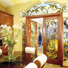 Какие витражи предлагает современный рынок? Новейшие техноло-гии производства стекла значительно расширили возможности функционального использования витража. Наряду с привычным использованием витража как заполнения проема, все чаще стали встречаться приемы, где стекло используется в самых непредсказуемых вариантах: как декор подвесных потолков; как разграничивающие пространство перегородки, ширмы; как оформление плафонов, бра; как вставки в мебель (буфеты, шкафы) или столешницы; или как декоративное оформление помещений, в виде панно или вообще сплошных плоскостей. Составленные из кусочков цветного стекла картины, сквозь которые проходит свет, также в моде. Достаточно необычно смотрятся витражи с зеркальным отражением. Изготавливаются они с помощью напыления на тыльную поверхность нитрида титана или подобного ему вещества. Причем отражающая способность такого зеркала может колебаться в любых желаемых пределах. Также можно изготовить зеркало с односторонней прозрачностью. Однако подобные произведения искусства не существуют сами по себе. Стеклянную композицию надо органично вписать в интерьер, чтобы она образовала с ним единое целое.