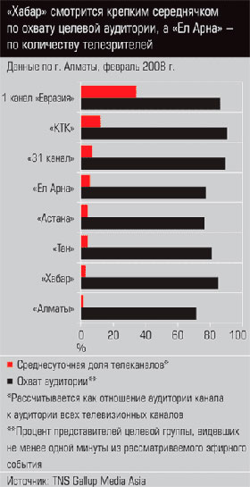 него входят 2 телеканала - «Хабар» (охватывает 95% территории РК) и «Ел Арна»