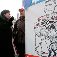 Подавляющее число манифестантов - пожилые люди, бывшие советские офицеры и деревенские женщины, приехавшие из соседних с Киевом сел. Рядом с ними были молодые люди, и только они могли объясниться по-английски. 26-летняя Таня говорит, что «выступает только за интересы Украины», она ничего не хочет слышать об «американцах, русских или поляках», и ее мечта - чтобы появились новые лидеры, «которые с гордостью возглавят нашу древнюю нацию». Вокруг нее - группы сверстников, в черных куртках и джинсах, они скандируют: «НАТО - нет, НАТО - нет», в то время как ораторы в мегафоны призывают к созданию «федерации с Россией, Белоруссией и Украиной, чтобы помешать новым массовым убийствам в Багдаде».