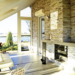 Искусственный камень используется в основном для отделки фасадов домов, сегодня всё чаще находит применение в интерьерах. Визит «каменного гостя» обусловлен целым рядом достоинств материала, в первую очередь - декоративных. Даёт возможность отделывать им стеновые конструкции из гипсокартона. Изделия, как правило, не нуждаются в обработке, подпиливании, а наличие угловых элементов позволяет добиться предельно аккуратной облицовки прямоугольных колонн, дверных и оконных проёмов, каминных порталов. Искусственным камнем можно облицевать весь камин и дымоходную трубу, а можно лишь портал, топочную камеру или каминную полку.