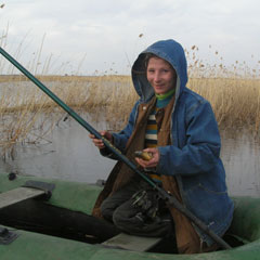 ...После загаринского Тобола мы отправились в карасиный Тунгуюк. Едем километров 20 по черным изувеченным огнем полям, проезжаем небольшое, но очень приличное строение, именуемое здесь «таможней» (до границы с Россией рукой подать), затем доезжаем до остатков некогда добротного поселка под «толстовским» названием «Каренинка». Отсюда до фантастического красного карася - рукой подать. Несколько километров вдоль и поперек бывших зерновых клеток - и мы у цели. Приехали не плутая, а все потому, что с нами - проводник. И тоже - рыбак, вернее, рыбачка. Людмила Шевченко - уроженка Загаринки. Ей двадцать с небольшим. Большую часть своей жизни она прожила в деревне. Вместе с отцом косила сено на комбайне и ловила легендарных щук, вместе с мамой занималась скотиной, птицей, огородом и запекала щук в русской печке. Теперь она живет в Костанае, а в Загаринку ездит преимущественно на рыбалку. Знает в этих местах каждый изгиб любимого Тобола, каждое озерцо, каждый прудок. Из Тунгуюка Люда самолично выловила не одну сотню карасей. По приезде она сразу же находит свое прошлогоднее клевое место. Раскладывает удочку, надевает на крючок четверку половинку красного живенького червячка. Заброс... Поплавок пристраивается под самым сухим камышом. Глубина - метра полтора. А ветер северный, промозглый, порывистый. И лед еще то там, то сям застыл на озере айсбергами. Загаринская рыбачка сидит в лодке под камышом и знает, что клева не будет. Здешний карась - совсем не аксуатовский - слишком капризный. Зимой даже не подумает клевать, а по теплу - если вдруг надумает. Но тепла нет. Мало того, даже у берега дно озера еще замерзшее: идешь по нему - скользко, и только сверху вода.