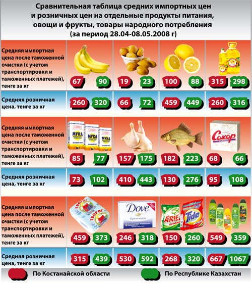 Все данные сведены в таблицу, которую мы для читателей несколько видоизменили, дополнив костанайские цены для сравнения со среднереспубликанскими. Зеленые - это костанайские, красные - по Казахстану. Верхняя линия - сразу под картинкой - это цены ввоза. Или, на языке специалистов, цены после таможенной очистки. Как «НГ» пояснили в департаменте, это то, сколько стоит импортный товар после прохождения всех таможенных процедур и платежей. Дальше, двигаясь от оптовой базы до магазинной витрины, товар дорожает. Его розничные цены (также костанайские и средние по республике) - это нижняя линия нашей схемы.