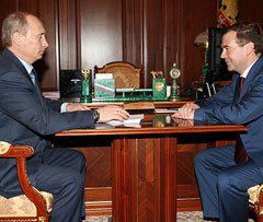 Медведев утвердил новый состав правительства. В понедельник государственное телевидение показало встречу двух политиков в Кремле: Путин занимал то же кресло, которым традиционно пользовался во время президентства, а Медведеву досталось гостевое кресло. Официальный представитель Кремля Александр СМИРНОВ отметил, что четкого протокола о том, кто и где должен сидеть, не существует, а потому, заявил он, было бы ошибкой вкладывать в этот факт слишком много смысла.