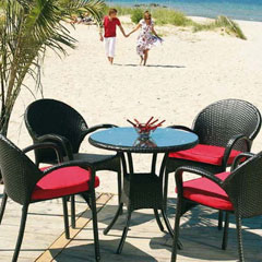Плетеную мебель делают не только из натуральных материалов, но и из современных полимеров. В качестве каркаса в такой мебели используется алюминиевая или стальная труба. Затем каркас оплетается разноцветными пластиковыми шнурами. Эти изделия можно мыть, и они имеют большой срок службы.