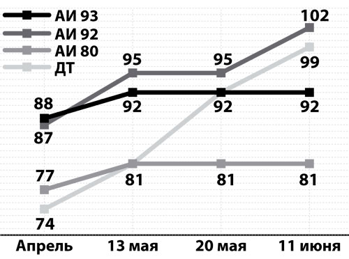6 июня стоимость литра бензина марки АИ 92 на большинстве костанайских АЗС повысилась до 102 тенге, перешагнув психологическую отметку. При этом некоторые фирмы удержали цену топлива на прежнем уровне и даже снизили на 2 тенге. Специалисты связывают подорожание с ценовой политикой российских нефтяных компаний.