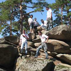 Из дневника команды «Дети»: «В поисках воды мы пошли искать родник. О его местонахождении имел представление только Волк (Костя Хрыльченко - «НГ»), и то смутно. Сначала мы шли вдоль берега у подножия холма Синюха. Дождь к этому времени уже закончился, тучи рвались, пропуская к земле яркие солнечные лучи. Мы шагали по камням, скользили, падали, снова шли вперед. Параллельно проводили акцию «Зеленый патруль»: собирали мусор. Прошло 2 часа, родника все не было. Уже собираясь возвращаться обратно, услышали возглас Славы: «Да вот же он, его надо только почистить!» Оказалось, мы проходили мимо него 4 раза. Набрав воды, мы вернулись в лагерь, приготовили обед. Затем Тимоха повел нас на холм Корова, где вволю нафотографировались. Мы даже нашли валун в форме бейсболки».