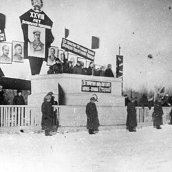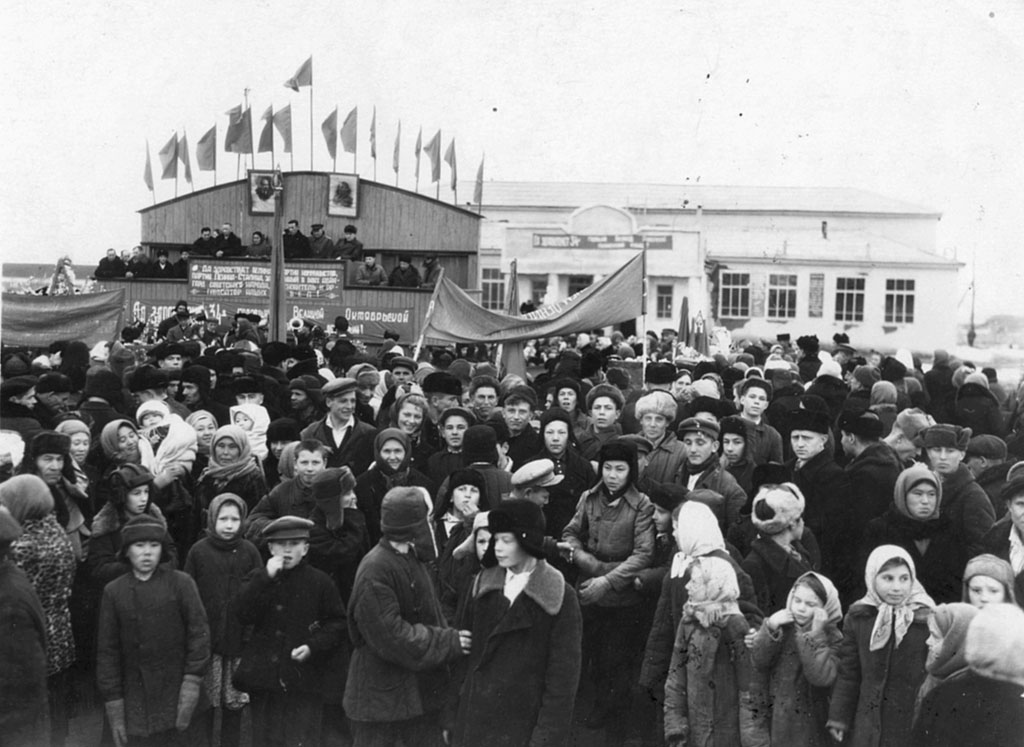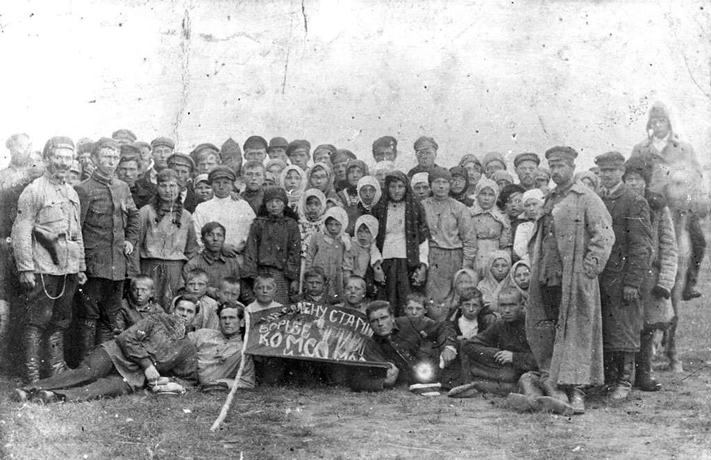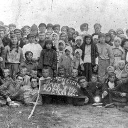 1924 г Кустанайский уезд. Затобольская волость, п.Нечаевка. Участники демонстрации, посвященной Международному юношескому дню. На переднем плане - первое знамя комсомольцев Нечаевки с надписью: «На смену старшим, в борьбе уставшим, комсомол идет!»