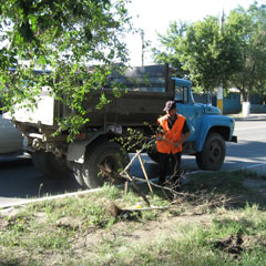 Костанайский пенсионер Анатолий СЛЕПЧЕНКО с возмущением показывает валяющиеся вдоль обочины деревца с зелеными листьями: