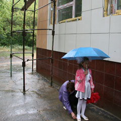 Первым препятствием на пути перед попаданием в школу для виновников торжества - первоклашек - оказалась... новая дверь. Ее с трудом смогли открыть только их родители. Внутри школы витал запах краски, а на стенах по всюду были видны следы побелки. В закрытых детских раздевалках, за школьными партами были спрятаны рейки. По новому линолеуму идти было весьма проблематично. Невольно вспомнили рекламу о волшебных пузырях. В туалете в одной из раковин ярко красовалось пятно засохшей краски. Унитазы без сидушек, на некоторых дверях туалетов нет задвижек. На первом этаже в кабинете начальных классов в ряд были сложены рейки, около стены стояла школьная доска. По словам учителей, кабинет будут доделывать в первую неделю нового учебного года. На 2-ом этаже школы, где проходила линейка, линолеум не пузырился да и следов побелки на плинтусах не увидели. Зато на третьем - на свежевыбеленном потолке обнаружили желтые разводы. Отремонтированная в этом году крыша при первых же дождях дала течь.