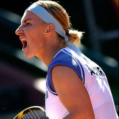 Имея четыре (!) сетбола, Кузнецова умудрилась не реализовать ни одного, а потом и вовсе отдала гейм на своей подаче. Медина Гарригес, почувствовав слабость соперницы, заиграла активнее, испанская публика разгорячилась... В итоге Светлана проиграла еще одну свою подачу, а уж выйдя в свою очередь подавать на сет, Анабель ошибок практически не допустила (это была прерогатива Кузнецовой) и повела в матче, взяв партию со счетом 7:5.